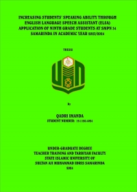 XMLQADRI IMANDA. 2023. “Increasing Students’ Speaking Ability Through English Language Speech Assistant (ELSA) Application of Ninth Grade Students’ at SMPN 34 Samarinda in Academic Year 2023/2024.” Thesis, English Education Department, Teacher Training and Education Faculty, State Islamic University Sultan Aji Muhammad Idris Samarinda. This research was under guidance of Mr. Dr. Shafa, M.Pd as the first advisor and Ms. Nadia Sya’ya, M.Pd., M. TESOL as the second advisor. Speaking was a complex process of oral communication that need much ability, including pronunciation, fluency, grammar, vocabulary, and comprehension. Speaking ability was regarded one of the most difficult aspects in language learning. In addition, there were many speaking problems that has been faced by students, especially in junior high school. The most common problem that students faced were they have very little knowledge about vocabulary and grammar, low motivation in learning English, and students feel anxious in speaking English. This research aims to find out of ELSA application in increasing students’ speaking ability of ninth grade students’ of SMPN 34 Samarinda. This research focused on quasi-experimental research in two class pre-test and post-test. The population of this research was class IX of SMPN 34 Samarinda in the academic year 2023/2024 which consists of 190 students. The researcher took 2 class as the research sample, namely class IX-A as the experimental class contained by 32 students and IX-D as the control class contained by 32 students. The data obtained from the speaking ability test while doing the speaking by themed picture in the pre-test and post-test. It can be concluded from the results of this study that the use of ELSA application was not able to increase students’ speaking ability which includes pronunciation, fluency, grammar, vocabulary, and comprehension. This can be seen in the average score of student’s pre-tests in experimental class which was 35.75 and control class which was 32.5. and then the average score of student’s post-tests in experimental class increase to 57.75 and control class increase to 33 and from the result of pre-test and also post-test was not reached the school minimum completeness criteria. This means that the use of ELSA application was not able to increase students’ speaking ability of ninth grade class of SMPN 34 Samarinda in academic year 2023/2024.