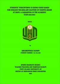 Khairunnisa Yasmin, 2024. “Students’ Perceptions in Using Video Games for English Vocabulary Mastery of Eighth-Grade at SMPN 18 Samarinda in the Academic Year 2023/2024. Thesis, Language Education Department, Tarbiyah and Teacher Training Faculty State Islamic University Sultan Aji Muhammad Idris Samarinda”. This research is under the guidance of Mr. H. Shafa, S.PdI, M.Pd, as the first supervisor, and Mrs. Nadia Sya’ya, M.Pd, M.TESOL, as the second supervisor. English is essential for communication worldwide but learning vocabulary can be challenging for non-native English-speaking students. Video games can be an attractive alternative to learning English, as they involve mastering vocabulary in various scenarios and circumstances. Students can develop positive or negative perceptions of video games they use for their vocabulary mastery. Understanding students' perceptions is crucial for teachers, as it helps guide the learning process effectively, keeping students engaged and preventing boredom in their education. This research aimed to investigate the students' perceptions in using video games for English vocabulary mastery and find out whether video games benefit students master English vocabulary. This research employed quantitative research with descriptive analysis. The participants were all eighth-grade students at SMPN 18 Samarinda, with a total of 126 students. The sampling technique used was saturated sampling. The data collection technique used the distribution of 25-question questionnaires via Google form, and the data analysis technique used descriptive frequency statistics to analyze student perceptions. The final calculation of data analysis in the statements concerning students’ perceptions in using video games to master English vocabulary resulted in a percentage of 74,86%, and the statements concerning whether video games benefited students in mastering English vocabulary resulted in a percentage of 73,32% showed that students positively perceive video games as a means of mastering English vocabulary. Students feel motivated to master the language with in-game tasks, goals, competitions, events, and interactions. The appealing features of sound clips, pictures, and graphics help students understand and master English vocabulary effectively.